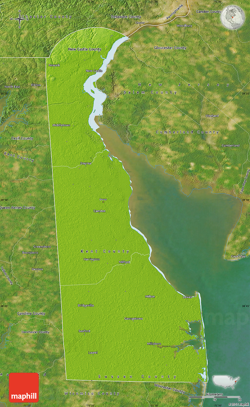 Physical Map of Delaware, satellite outside